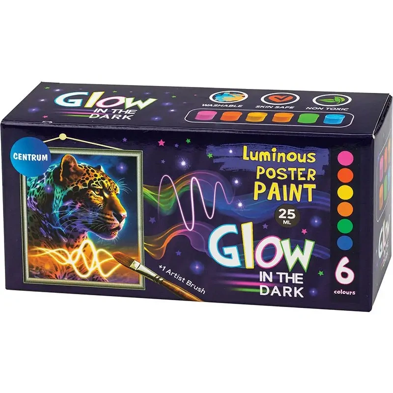 Helendavate Guaššvärvide komplekt koosneb 6 värvitoonist mis pakub intensiivseid, erksaid värve, mis lisaks kuivamisele pakuvad kuma pimedas efekti, muutes iga maali põnevaks elamuseks.