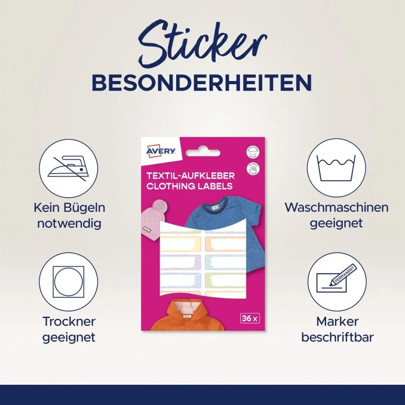 Avery Zweckformi spetsiaalselt tekstiilile mõeldud etiketid on nutikas ja lihtne viis laste riiete ja muude tekstiilide märgistamiseks.